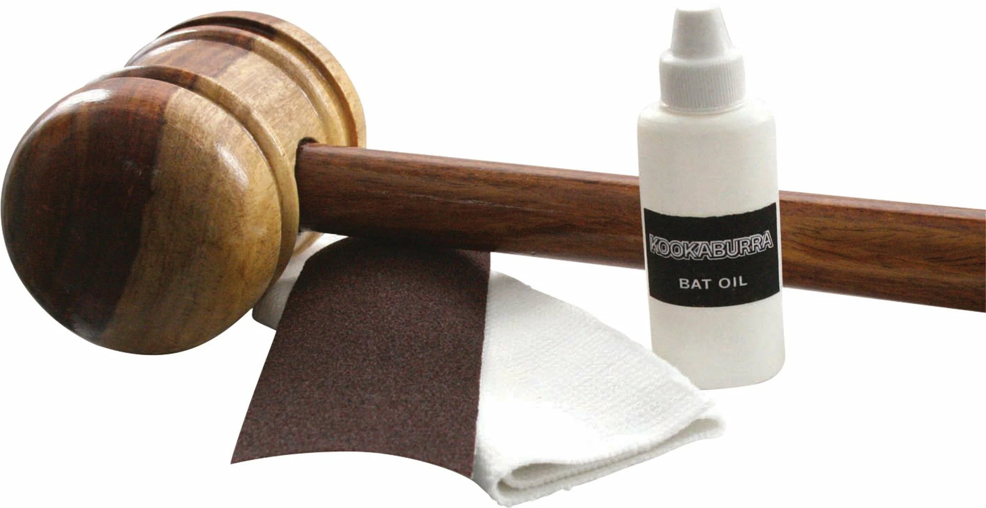 Repair care kit containing bat oil, soft cloth and bat mallet.